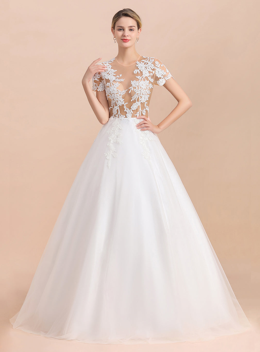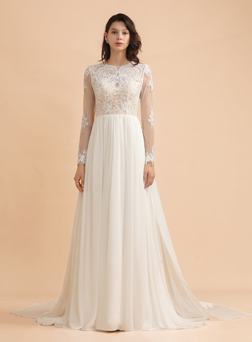 A-Linien-Brautkleid mit Rundhalsausschnitt, langen Ärmeln und Spitze, bodenlang
