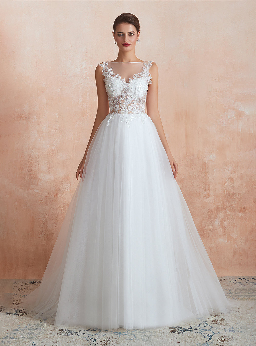 A-line Jewel Neck Lace Tulle Chapel Train Dress