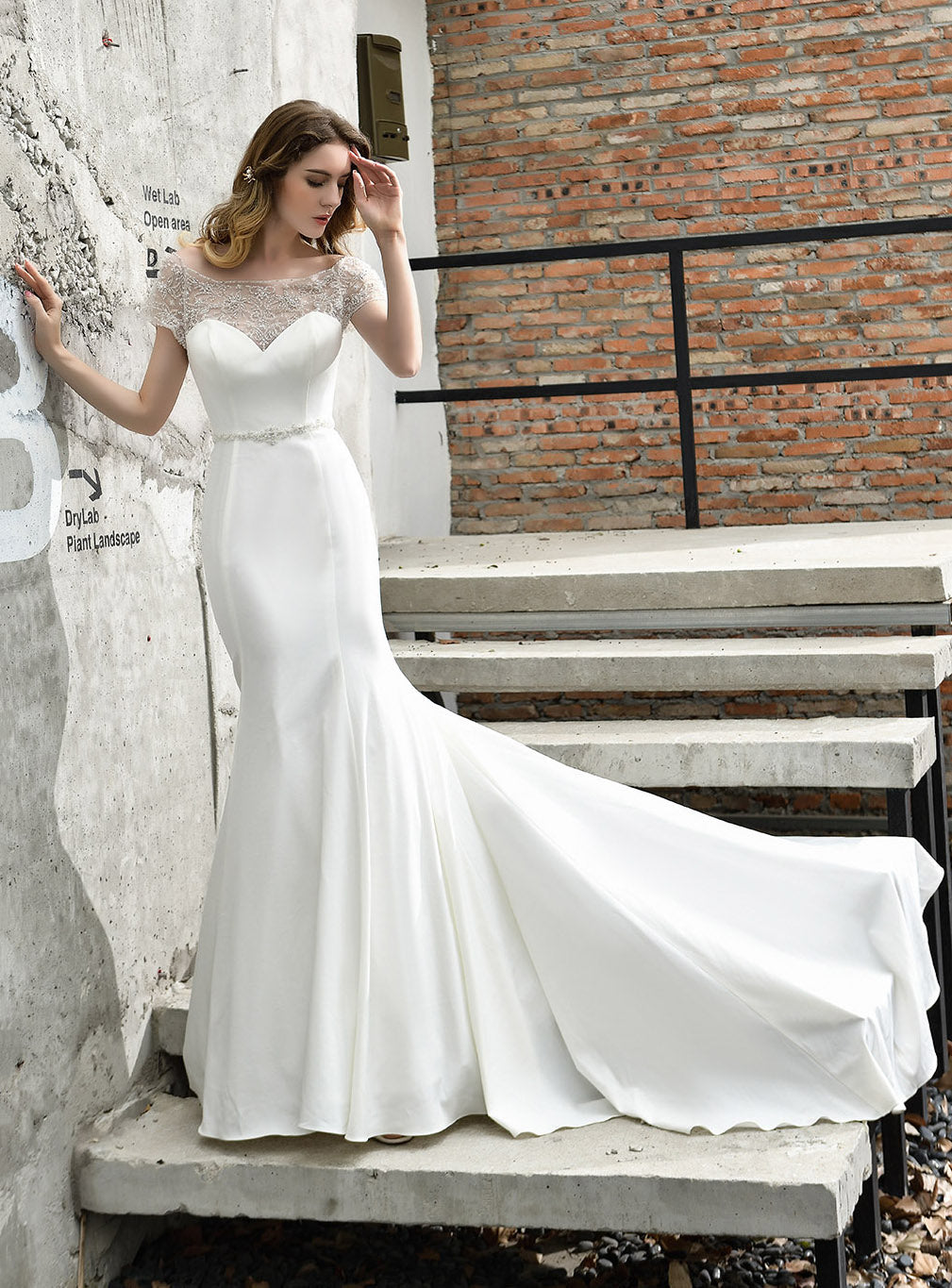 A-Linien-Brautkleid aus Satin mit 3/4-Ärmeln, knöchellanger Kapellenschleppe
