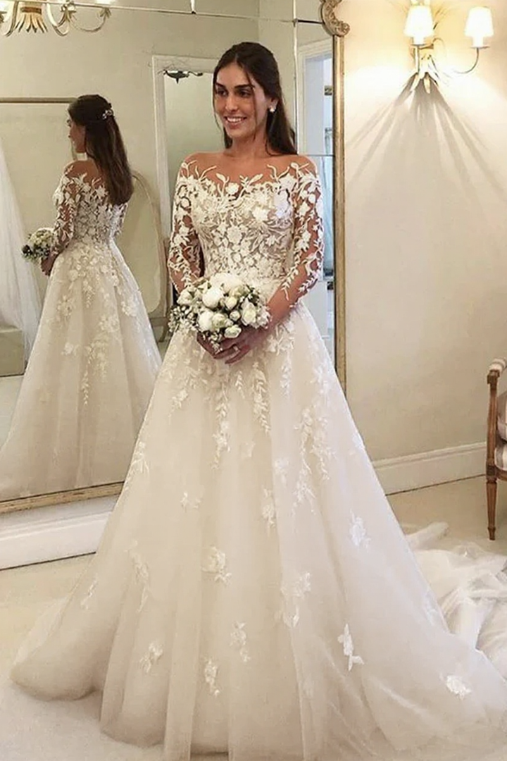 A-Linien-Hochzeitskleid aus Tüll mit floralen Spitzenapplikationen und Ärmeln