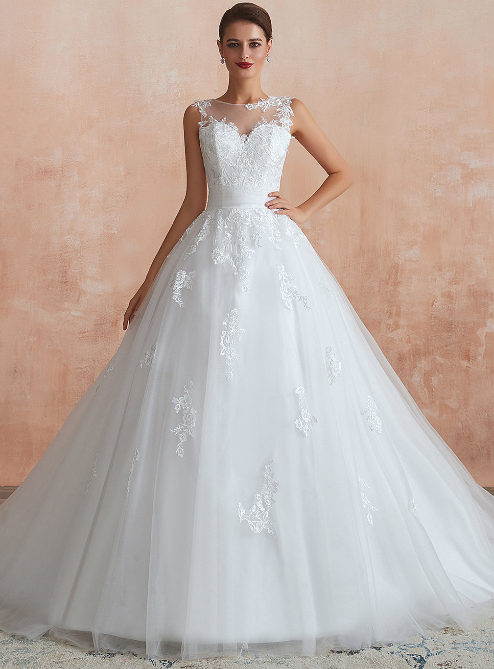 Ärmelloses A-Linien-Brautkleid aus Tüll mit Kathedralenschleppe und Applikationen