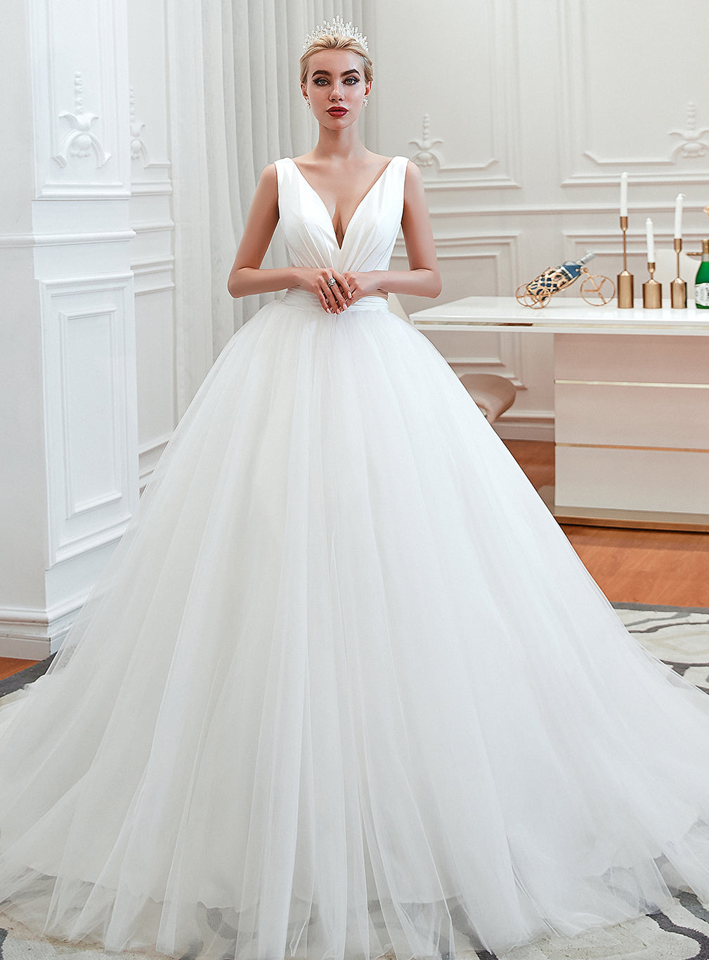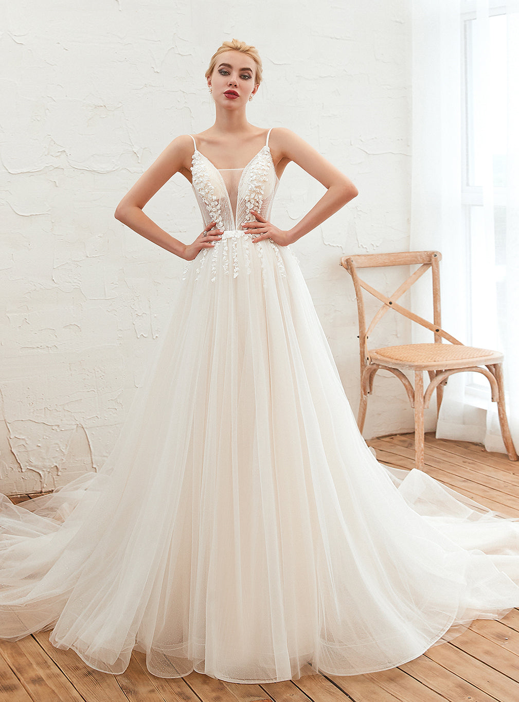 This classic A-line dress features a sleeveless bodice and a beautiful cathedral train made with high-quality tulle. Crafted with intricate appliques, this exquisite dress is sure to make you stand out on your special day.