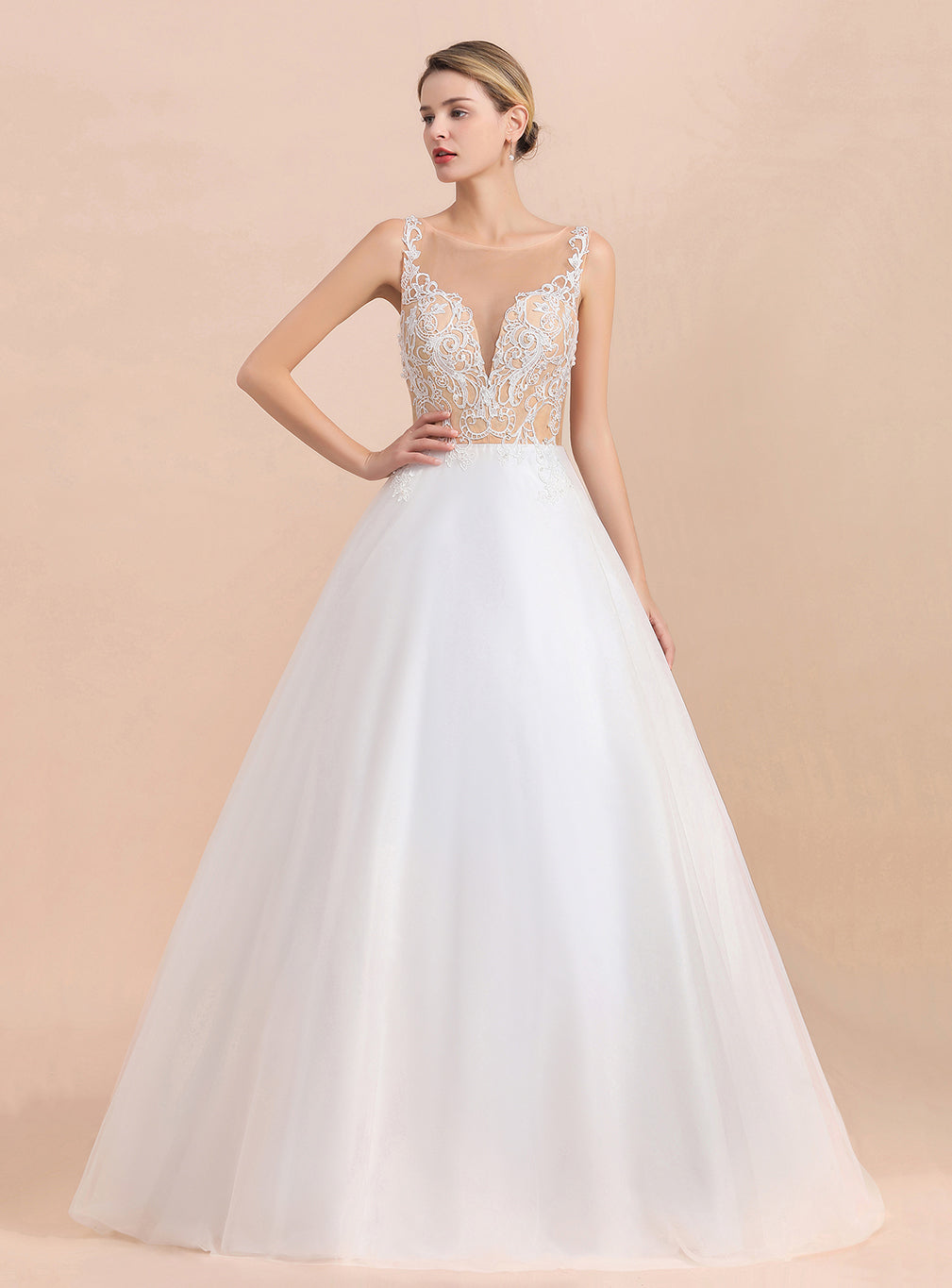 A-Linien-Brautkleid aus Spitze mit V-Ausschnitt, Spaghettiträgern und ärmellos