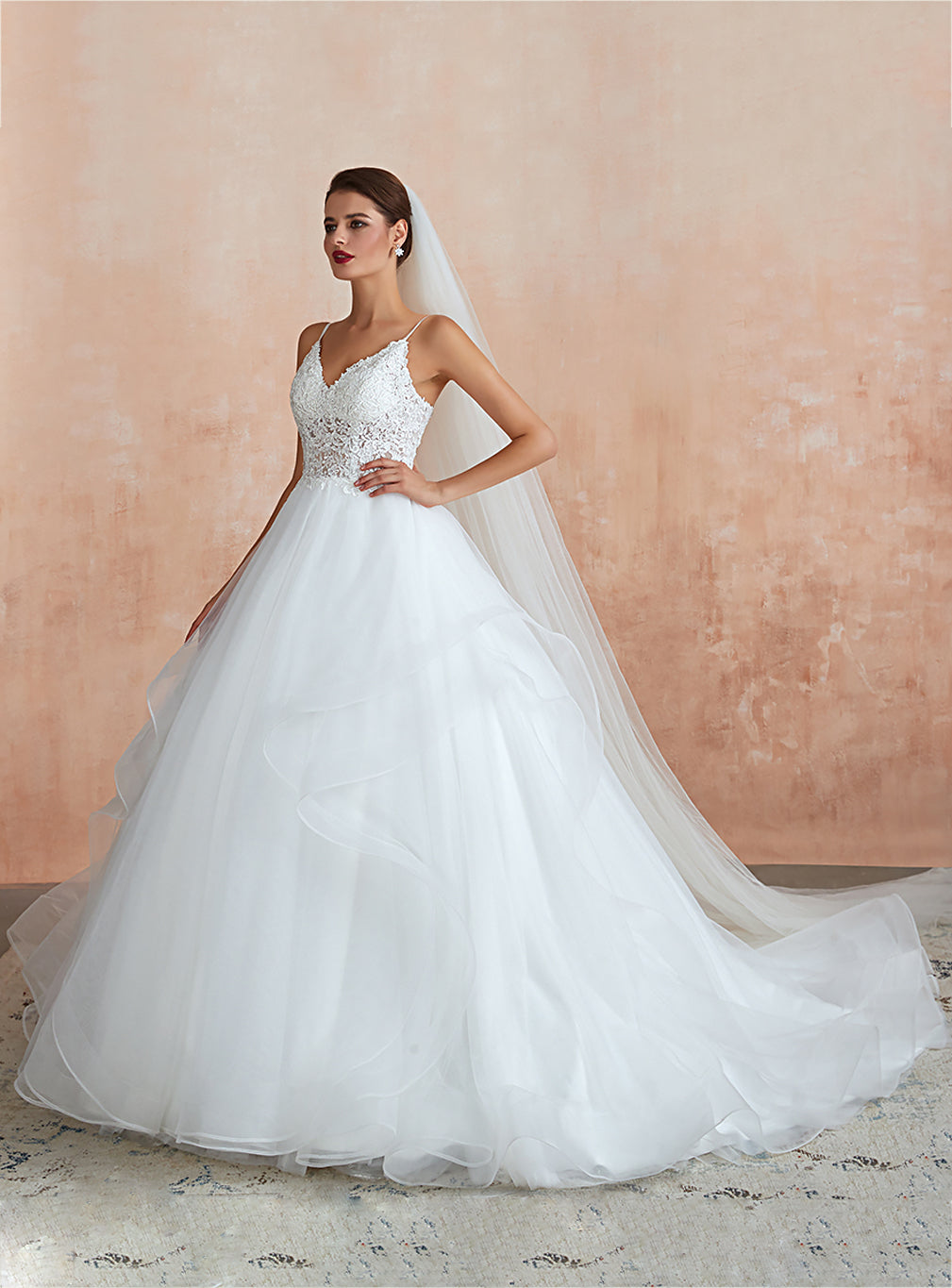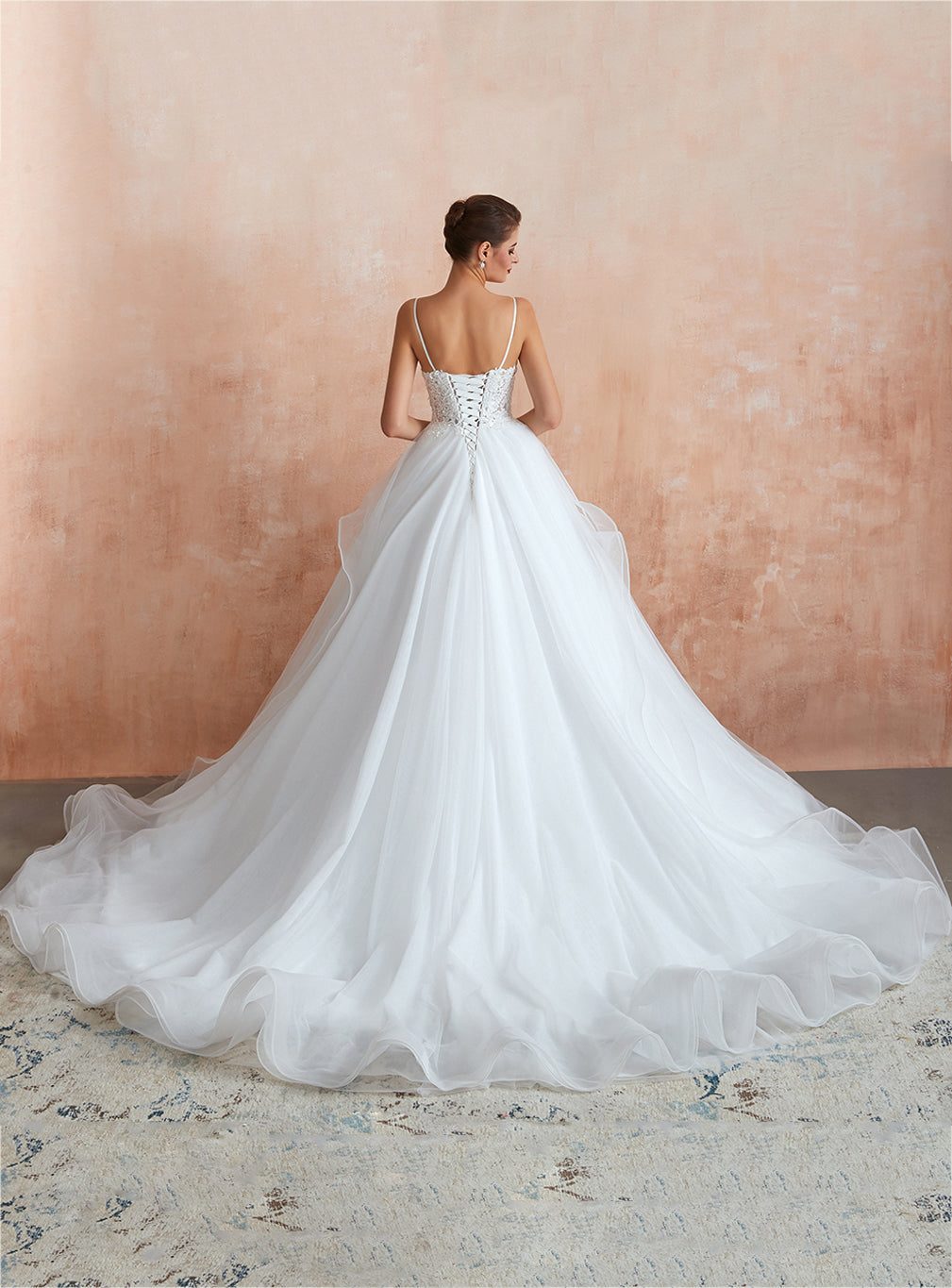 This stunning A-line dress is made of tulle and lace fabric, and features a sleeveless silhouette and a chapel train. Its classic lines create a timeless look that is perfect for any occasion.