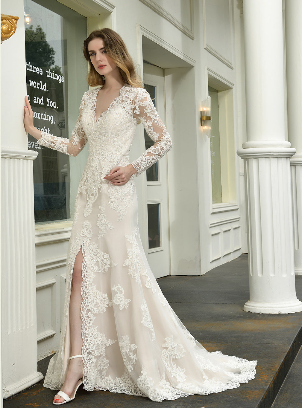 This Deep V-Neck Long Sleeves Slit Floor-Length Dress is the perfect choice for a special event. Featuring a deep V-neckline, long sleeves and a slit design, this dress is sure to make a statement. It is made from high-quality materials with a floor-length design that gives you an elegant look.Look stunning in this deep V-neck floor-length dress featuring long, slit sleeves, and a zipper closure. Its high-quality fabric is perfect for any occasion, making it the ideal statement piece.