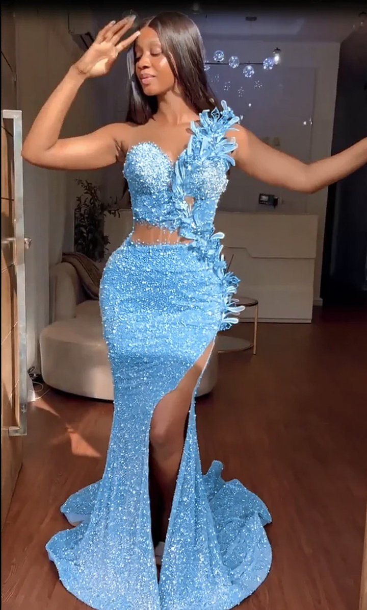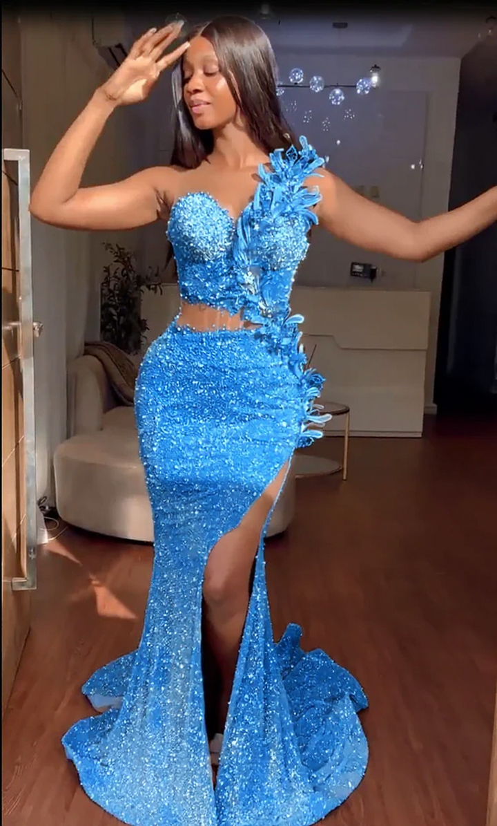 Vestidos formales de sirena con escote corazón y lentejuelas, largos y con abertura