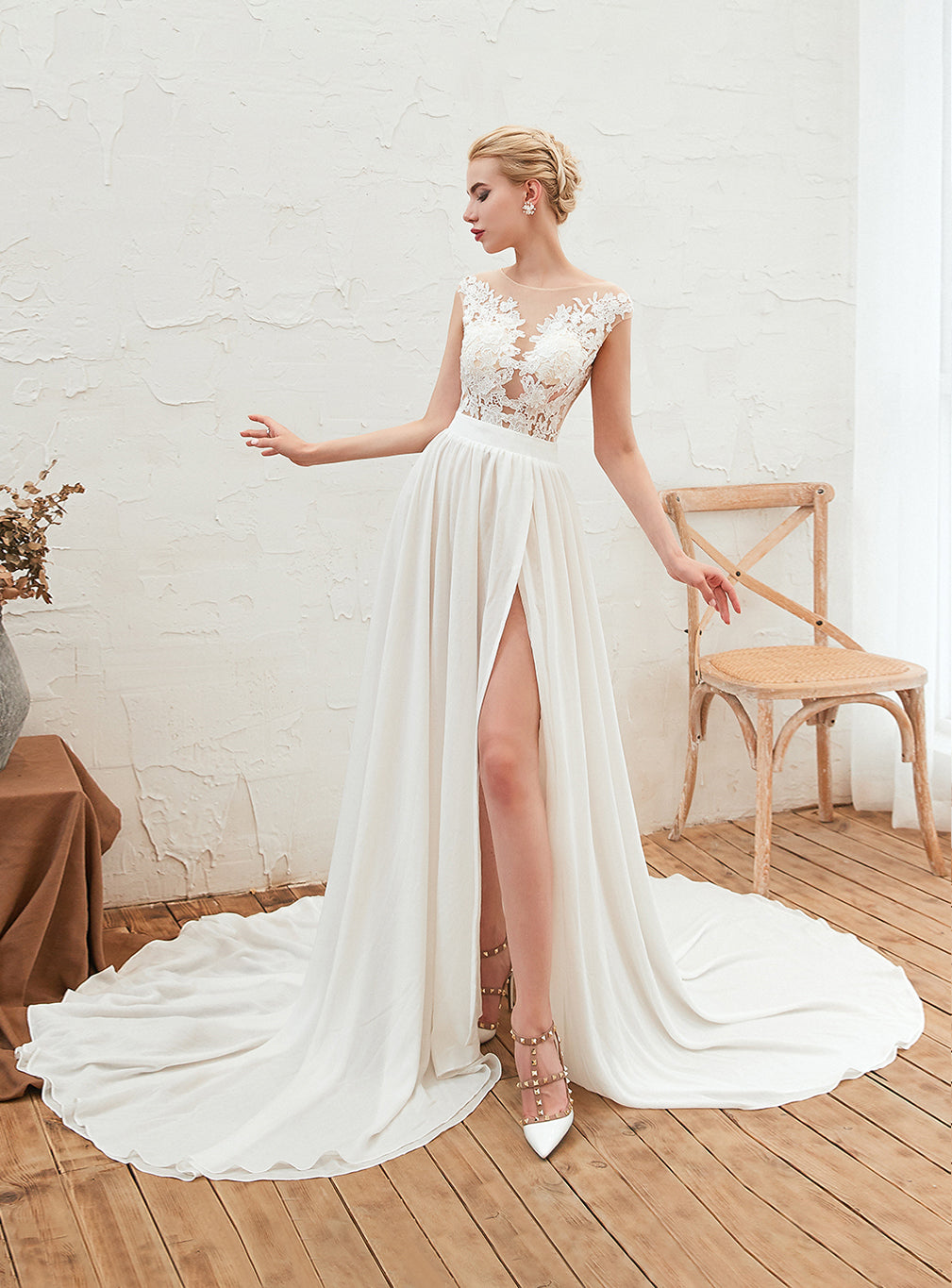 Robe de mariée trapèze en tulle à traîne chapelle et sans bretelles