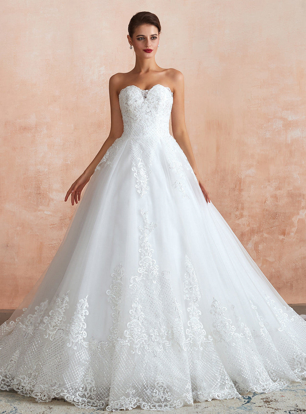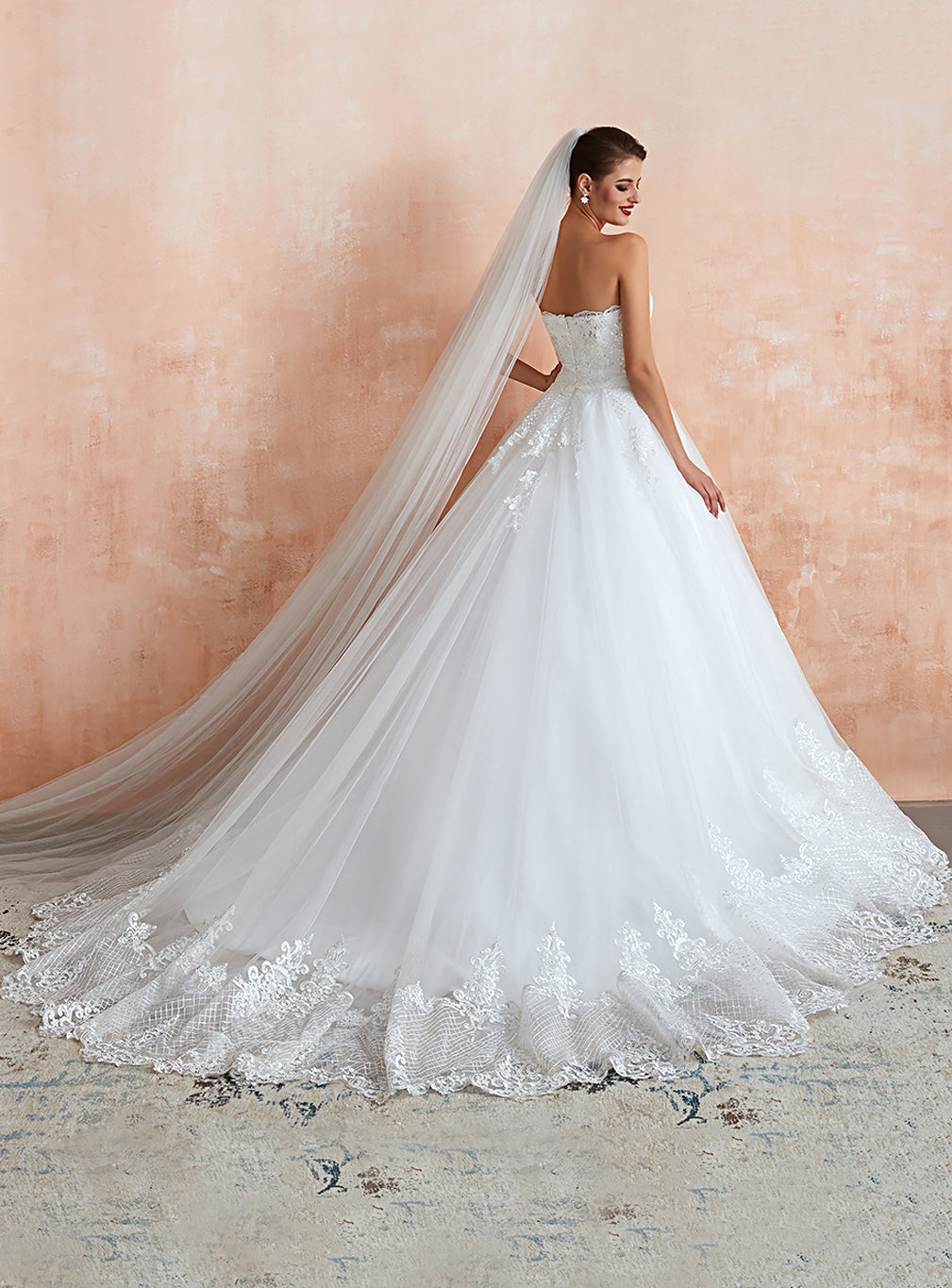This A-line Sweetheart Strapless Tulle Chapel Train Dress is perfect for your special day. The dress features a timeless A-line silhouette, sweetheart neckline, and a chapel train that adds a hint of drama and elegance. The tulle fabric is lightweight and comfortable, guaranteeing all-day comfort and a flattering silhouette. Make your wedding day one to remember with this beautiful dress.