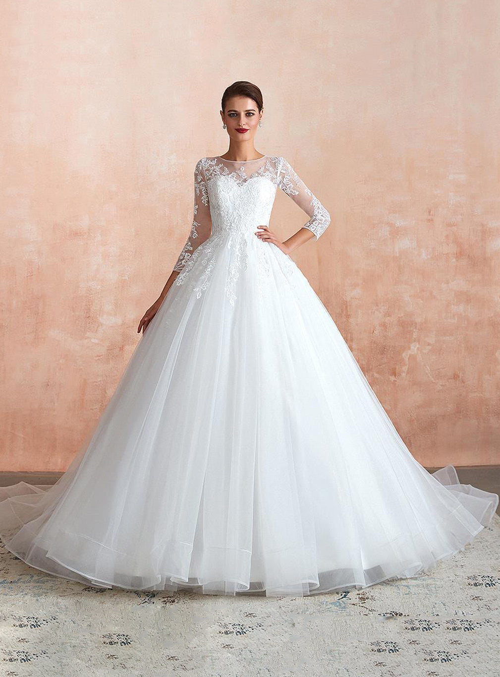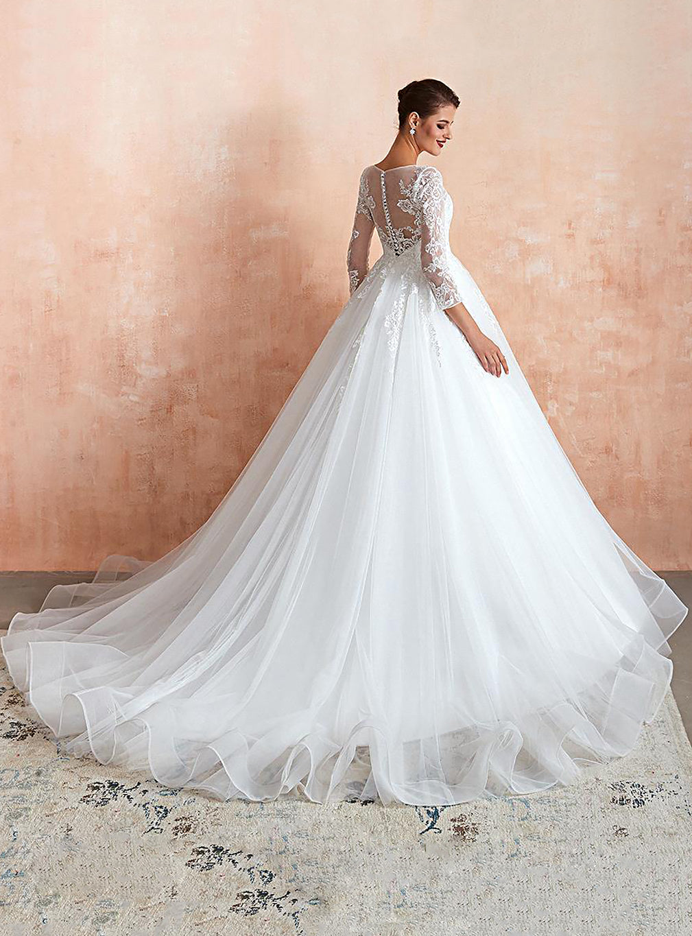 A-line Jewel Tulle Lace 3/4 Sleeves Chapel Train Ball Gown Wedding Dress