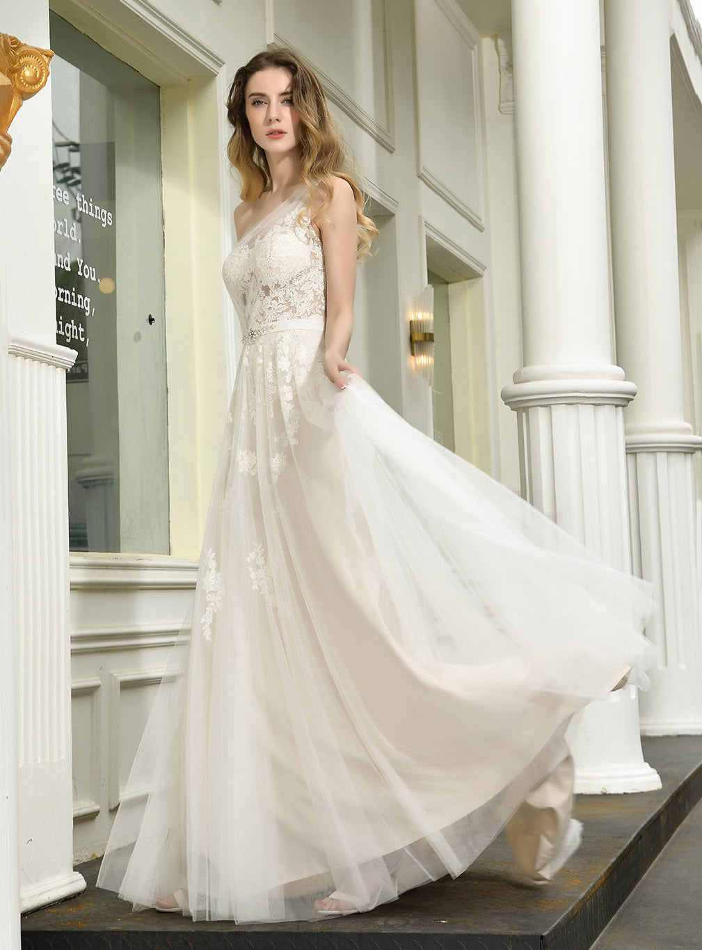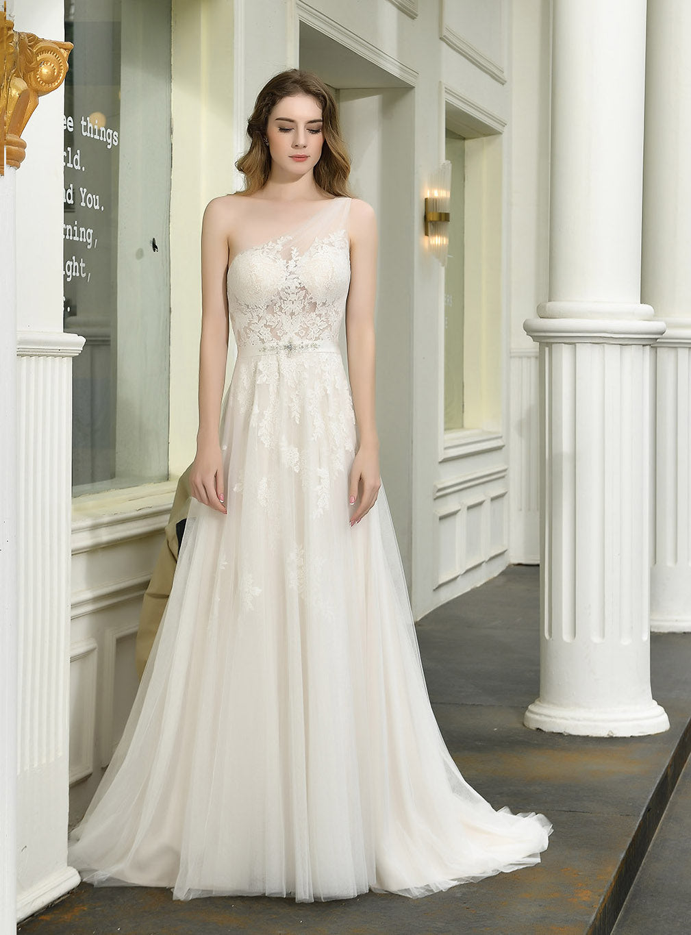 This timeless A-line Tulle One Shoulder Chapel Train Dress features a unique style with its delicate tulle fabric, chapel train skirt, and one shoulder design. Perfect for any special occasion, it will make you stand out and look elegant.