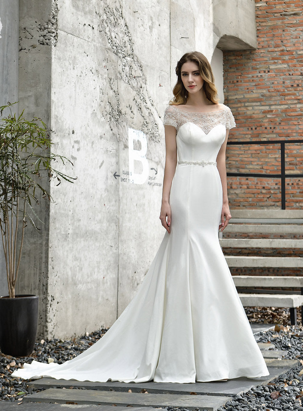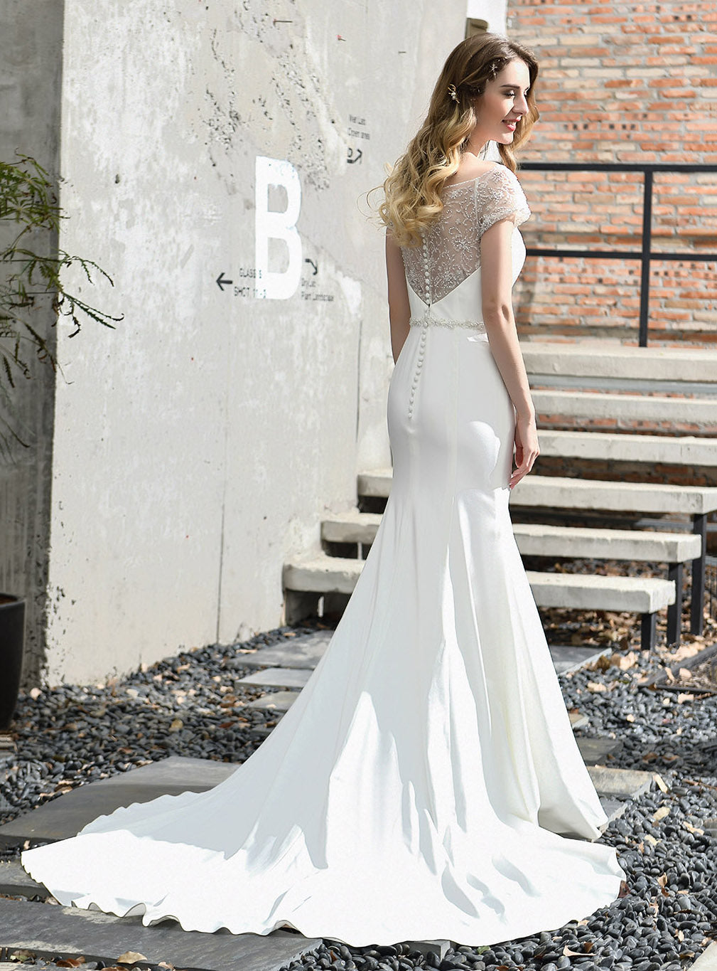 Mermaid Satin Lace Off-the-Shoulder Short Sleeves Chapel Train Wedding Dress
